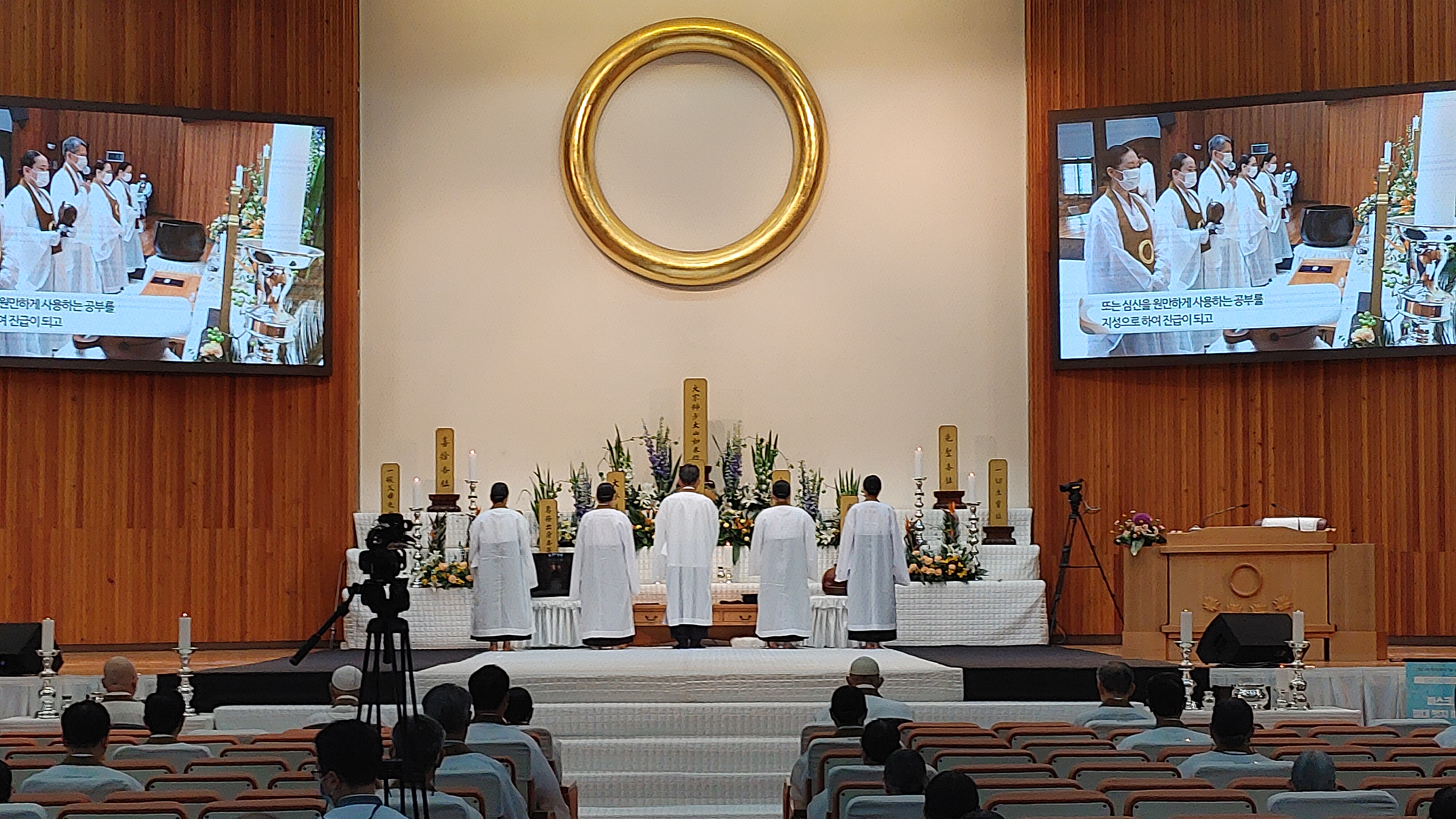 대중은 앉은 대로 합장 경례하며,